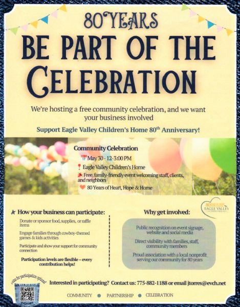 Join us for the 80th Anniversary Celebration at Eagle Valley Children's Home. This is a family friendly event with a laid-back cowboy theme, honoring the rich history of the ranch and Eagle Valley Children's Home that has shaped our organization for generations. It will be an afternoon of connection, gratitude and celebration welcoming staff, clients, and neighbors alike.