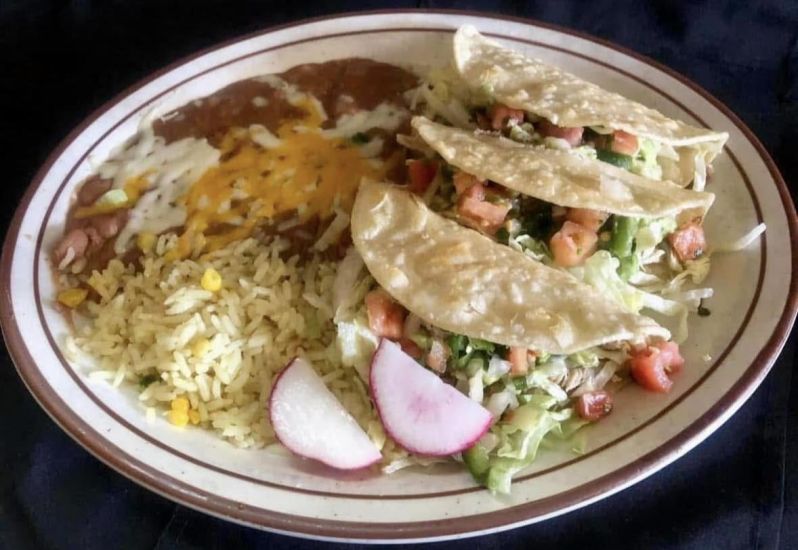 It’s 3 grilled corn tortillas covered with melted jack cheese, and stuffed with shredded chicken or shredded beef, lettuce, fresh pico de gallo, and guacamole. Served with special rice and beans. Yummy!!!